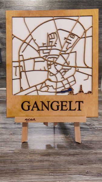 Mittels einen Lasers wird das Straßennetz aus einer Birkensperrholtplatte geschnitten und mit der Silhouette von Ganget versehen. Der Kahnweiher wird in einem satten blau farblich hervorgeheoben.Der Schriftzug GANGELT wird ebenfalls mit dem Laser eingraviert.