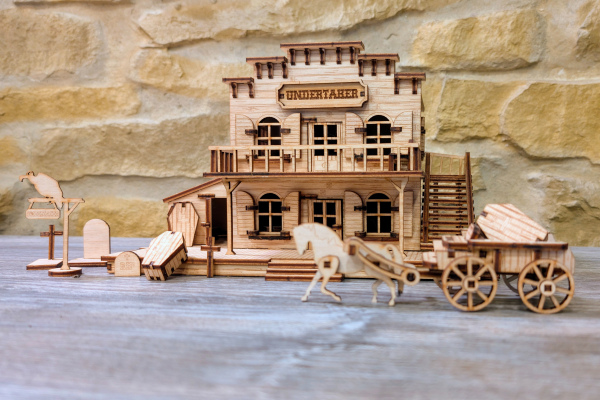 Auch im rauhen Wilden Westen fand das Leben irgendwann sein Ende. Dieser Bausatz lässt dich ein wichtiges Gebäude der damaligen Zeit nachbauen - den Undertaker, den Bestatter.